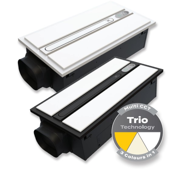 The AIRSWAY 6-In-1 Premium Bathroom Heater offers a unique oscillating sway design, as well as the latest technology in PTC bathroom heater models. Premium range offers 6-In-1 Functions – Heater, Exhaust Fan, Circulating Fan, Dry Heat, Sway and Light Unit. Patented Heat Breeze Technology heats the room while offering low level extraction to help reduce condensation build up in the bathroom. This premium line model features a single AC Motor, producing a 2150W output of powerful heat breeze, high volume extraction at 500m3/h, circulating fan to reduce warm temperature build up, and a 25W LED Tri-Colour switchable light.