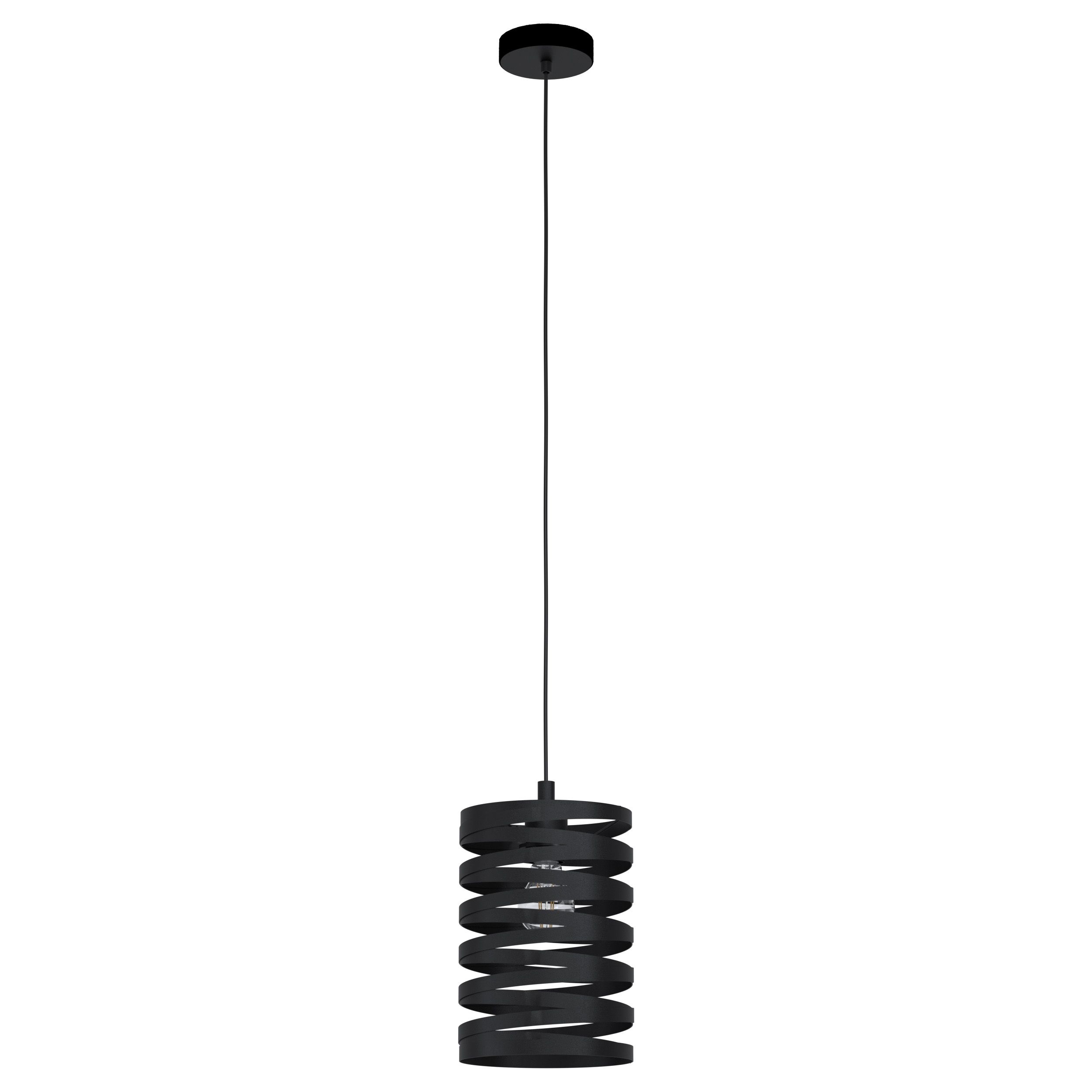 The decorative CREMELLA pendant light features black steel bands that spiral into a drum shade. The unique spiraling design of the pendant creates fascinating shadows within any room. Features: