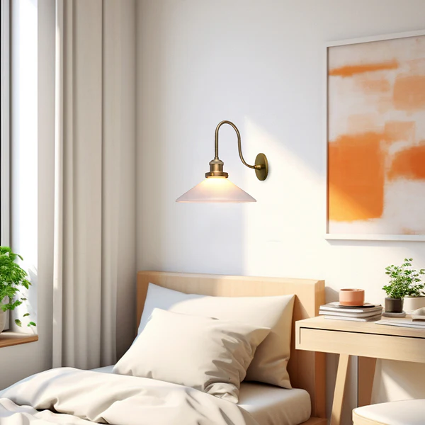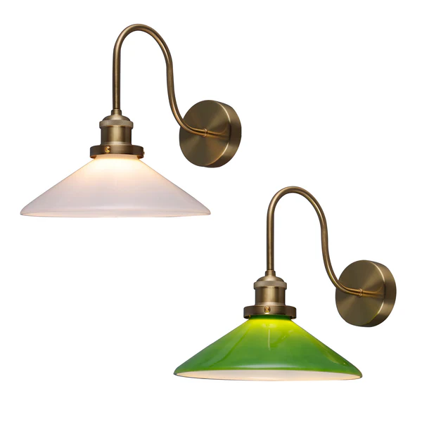 The Gemma Glass Wall Light combines vintage mid-century modern design with elegant functionality, featuring a stylish brass metal curved base and a cone-shaped white or green glass shade. This wall light effortlessly adds a sophisticated touch to any room, making it an ideal choice for bedrooms, bathrooms, living rooms, hallways, and more. It’s the ideal choice for those seeking both beauty and function in their lighting.