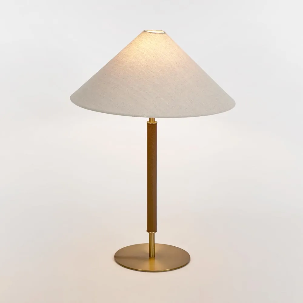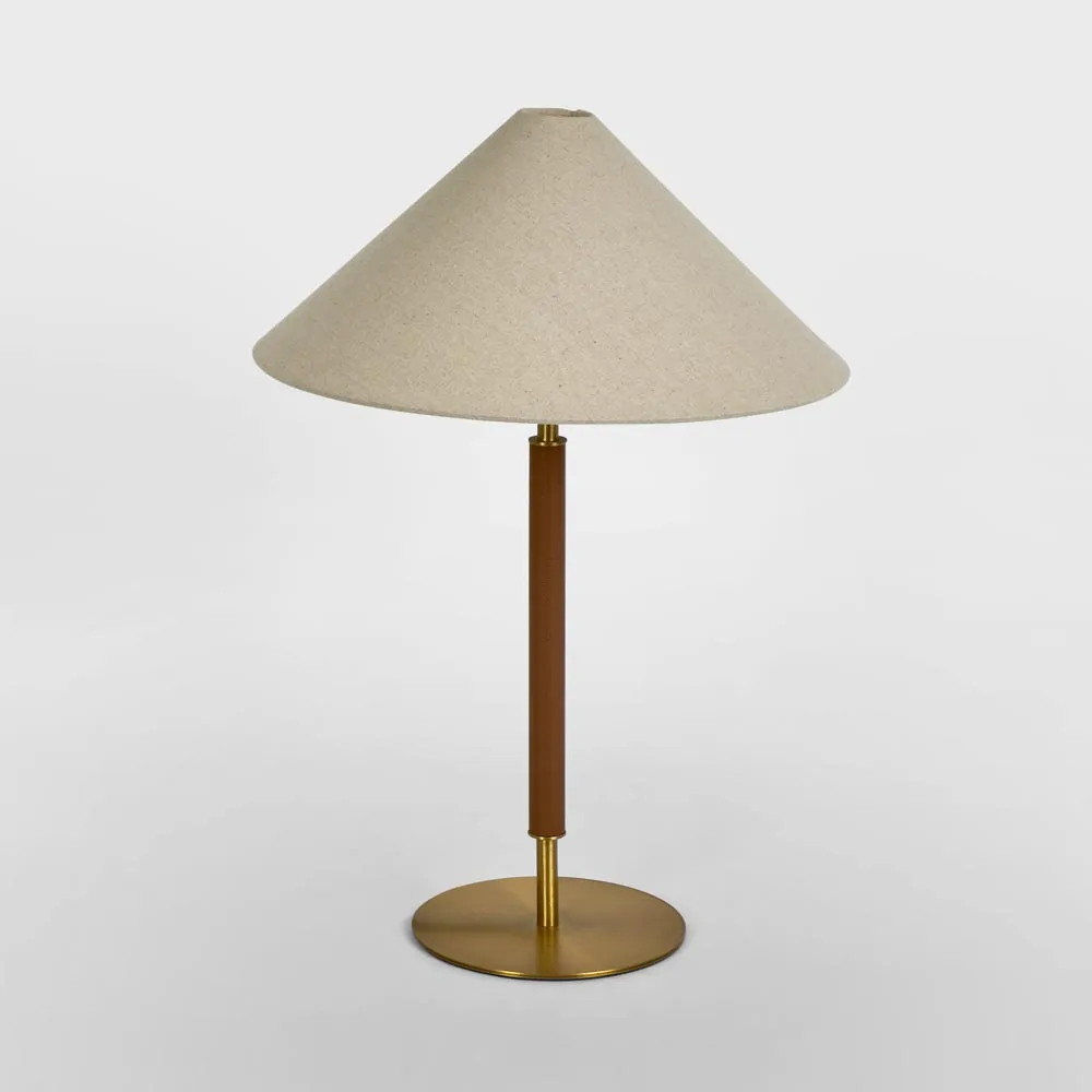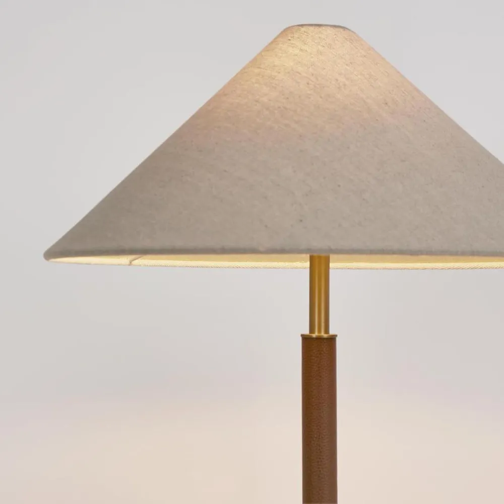 The Huntley Leather & Brass Table Lamp & Shade exudes elegance with its brushed warm brass finish and leather-look wrap. It features a stylish tapered linen lampshade that complements its sophisticated design.