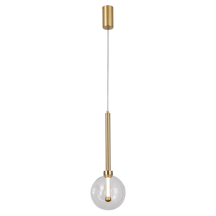 New elegant and stylish LED pendant light crafted from durable metal with a luxurious gold finish, complemented by clear dimpled glass sphere that creates a visually striking effect when illuminated.
